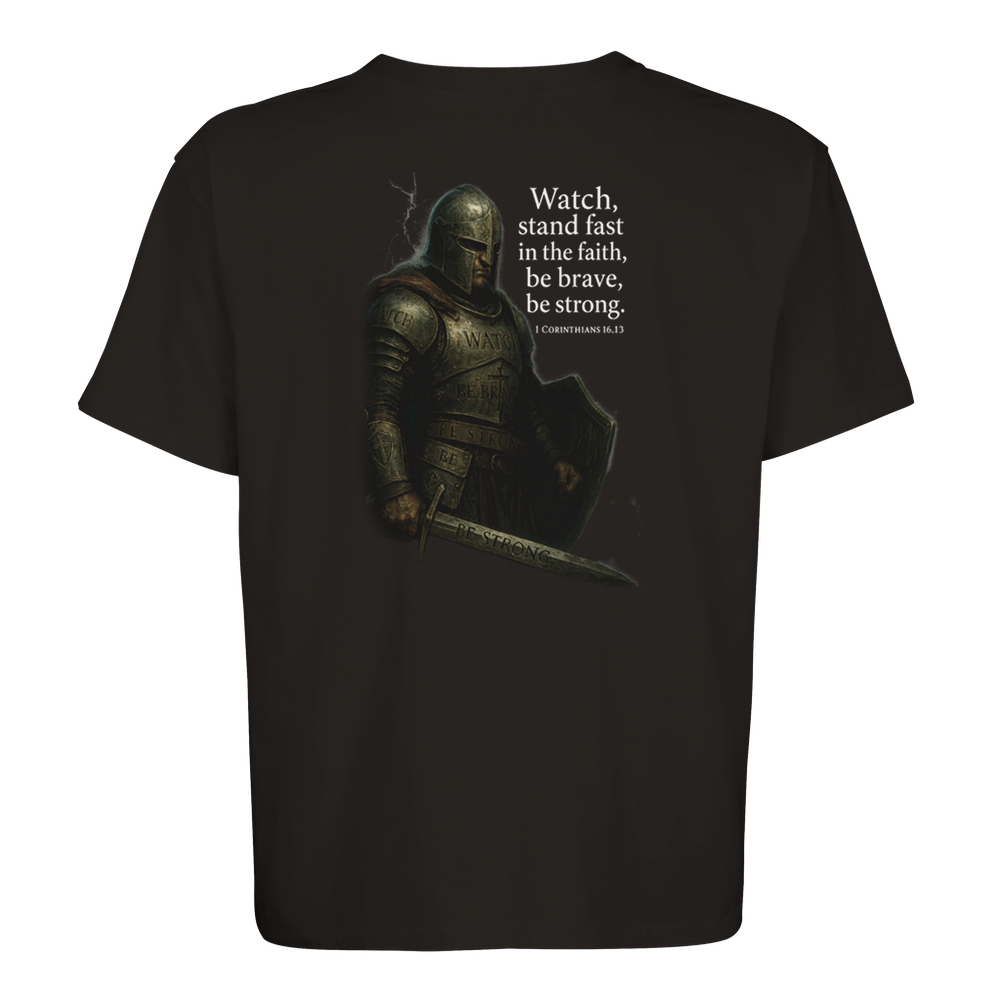 The 1 Corinthians 16:13 is a stylish and sustainable unisex oversized T-shirt made from a blend of recycled and regular cotton.