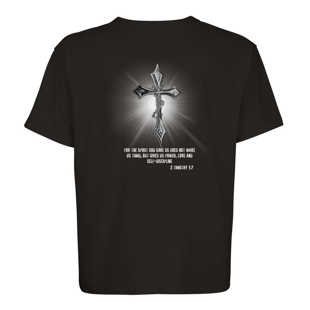 The 2 Timothy 1:7 is a stylish and sustainable unisex oversized T-shirt made from a blend of recycled and regular cotton.