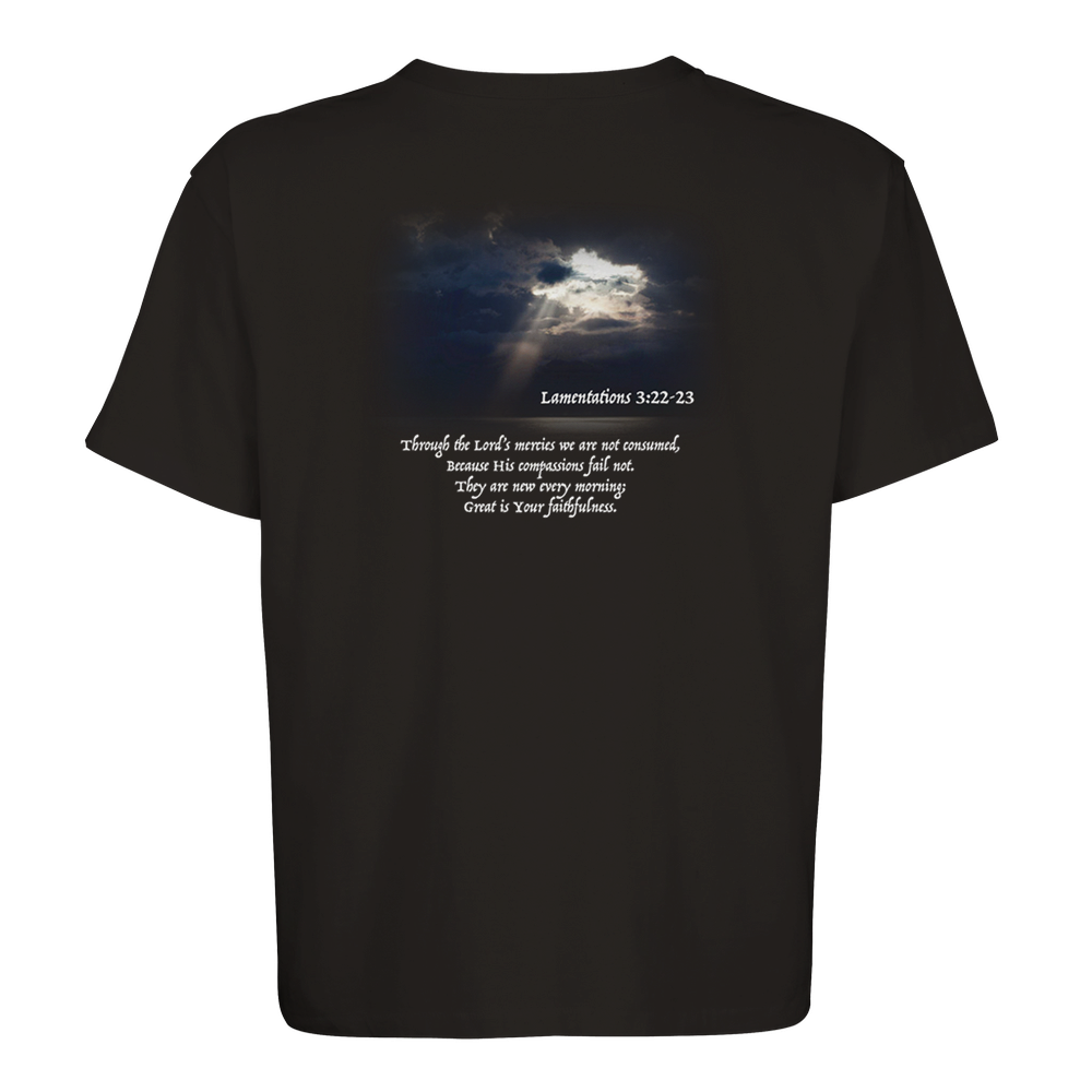The Lamentations 3:22-23 is a stylish and sustainable unisex oversized T-shirt made from a blend of recycled and regular cotton.
