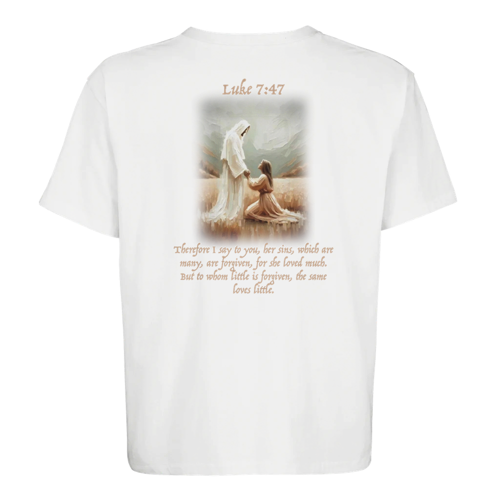 The Luke 7:47 is a stylish and sustainable unisex oversized T-shirt made from a blend of recycled and regular cotton.