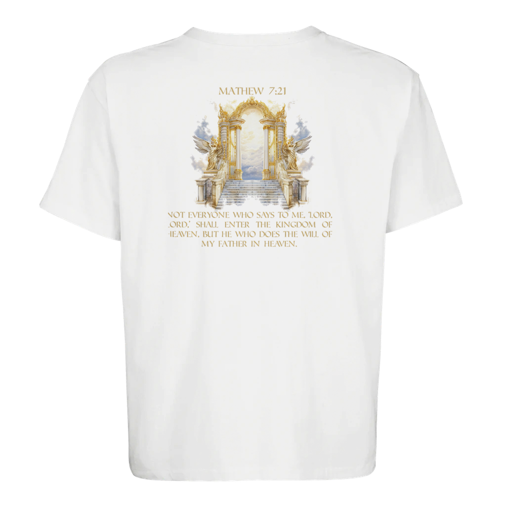The Matthew 7:21 is a stylish and sustainable unisex oversized T-shirt made from a blend of recycled and regular cotton.